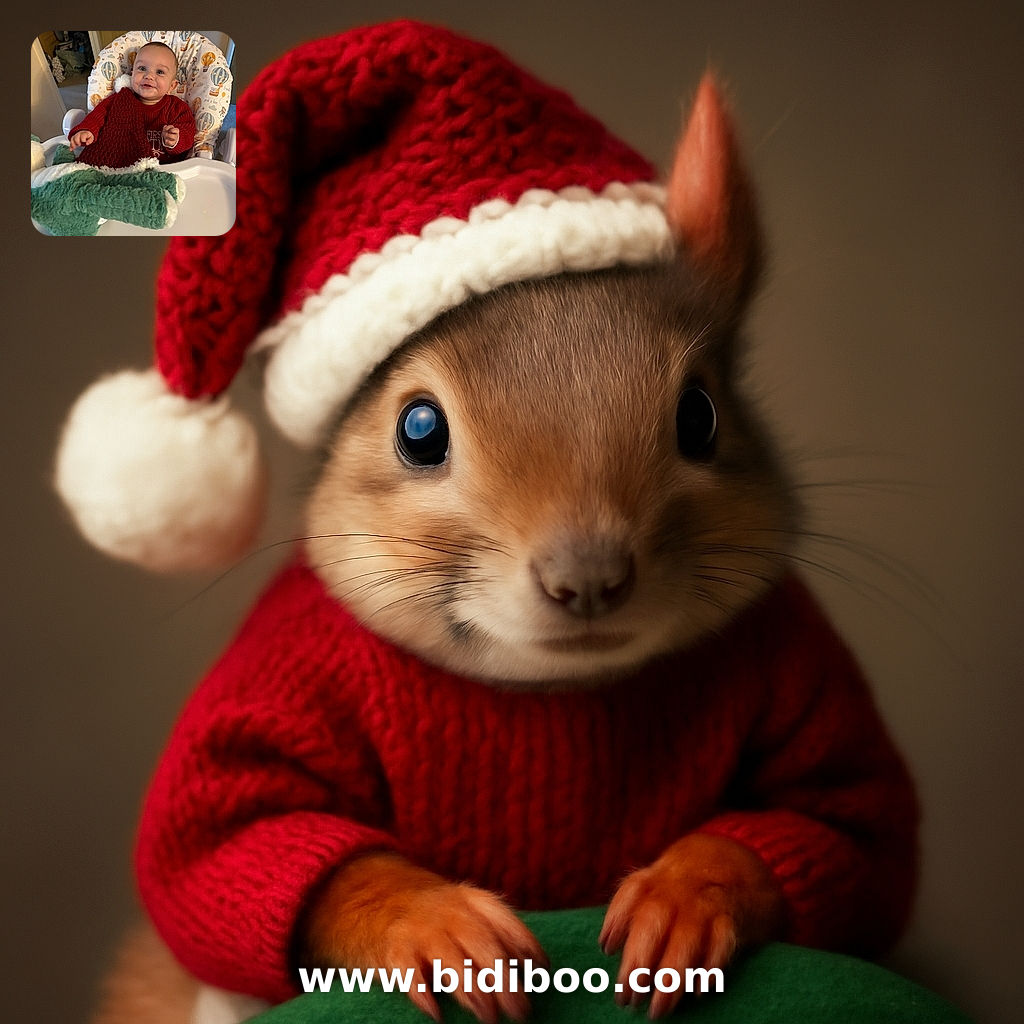 • A joyful baby in a festive red sweater sits in a high chair covered with a cute, colorful hot air balloon print. The baby is holding a large, fluffy green stuffed toy and a red knit Santa hat, grinning with excitement as if ready to celebrate their first Christmas.